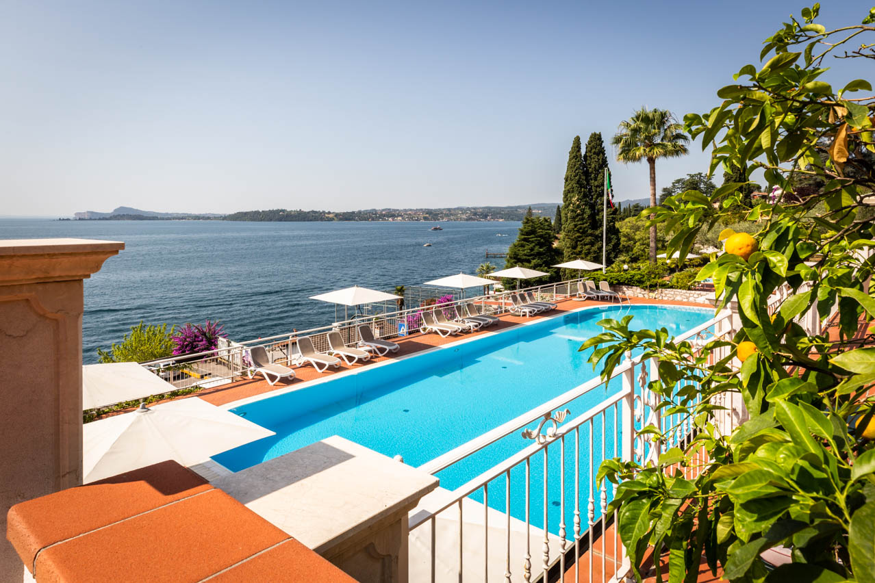 Der große Panoramapool des Hotels (27 x 9 Meter) bietet einen spektakulären Blick auf den Gardasee und die Gardainsel. Es liegt im Zentrum des Parks und ist von der Schönheit der Pflanzen und Blumen umgeben, die eine einzigartige Atmosphäre der Entspannung und Ruhe schaffen.